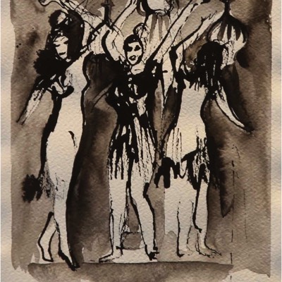 Tanssivat naiset ja temppeli, Dansande kvinnor och tempel, Daning women and the temple, Aquarelle and ink on paper 39*30cm