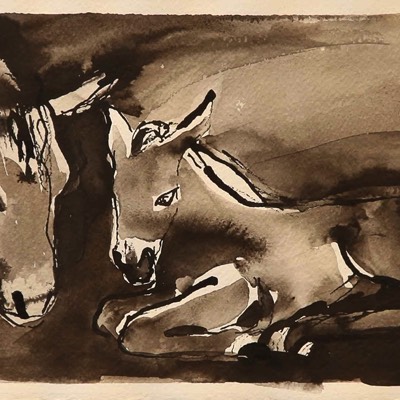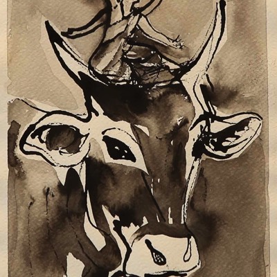 Nainen ja pyhä lehmä, Kvinnan och den heliga kon, The woman and the holy cow, Aquarelle and ink on paper 39*30cm