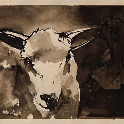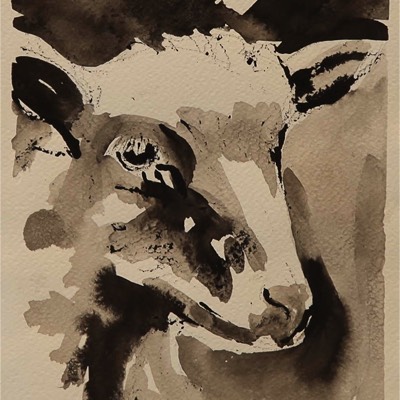Ajatuksissaan oleva lammas, Det tankfulla lammet, The thoughtful lamb, Aquarelle and ink on paper 39*30cm
