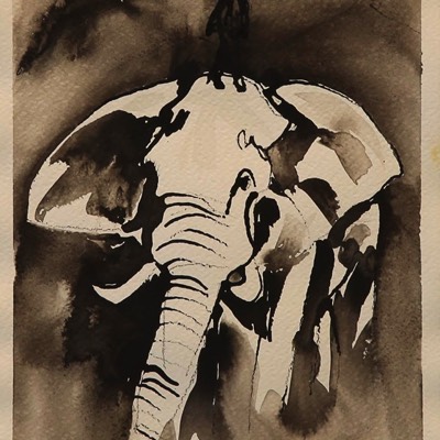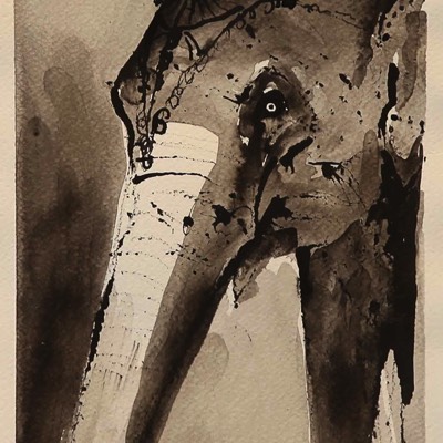 Pyhä elefantti, Den heliga elefanten,T he holy elephant, Aquarelle and ink on paper 39*30cm