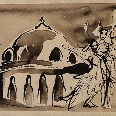Dancing on the church steps, Aquarelle and ink on paper 39*30cm